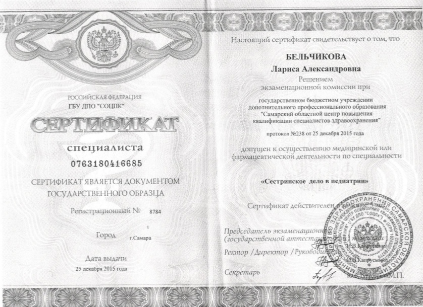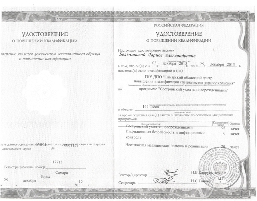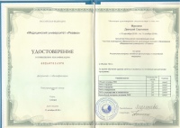 В 2009 году прошел курс усовершенствования на базе Самарского государственного медицинского университета на цикле «Клиническая допплерографии» (УЗД сосудов шеи, сосудов конечностей, сосудов брюшной полости).